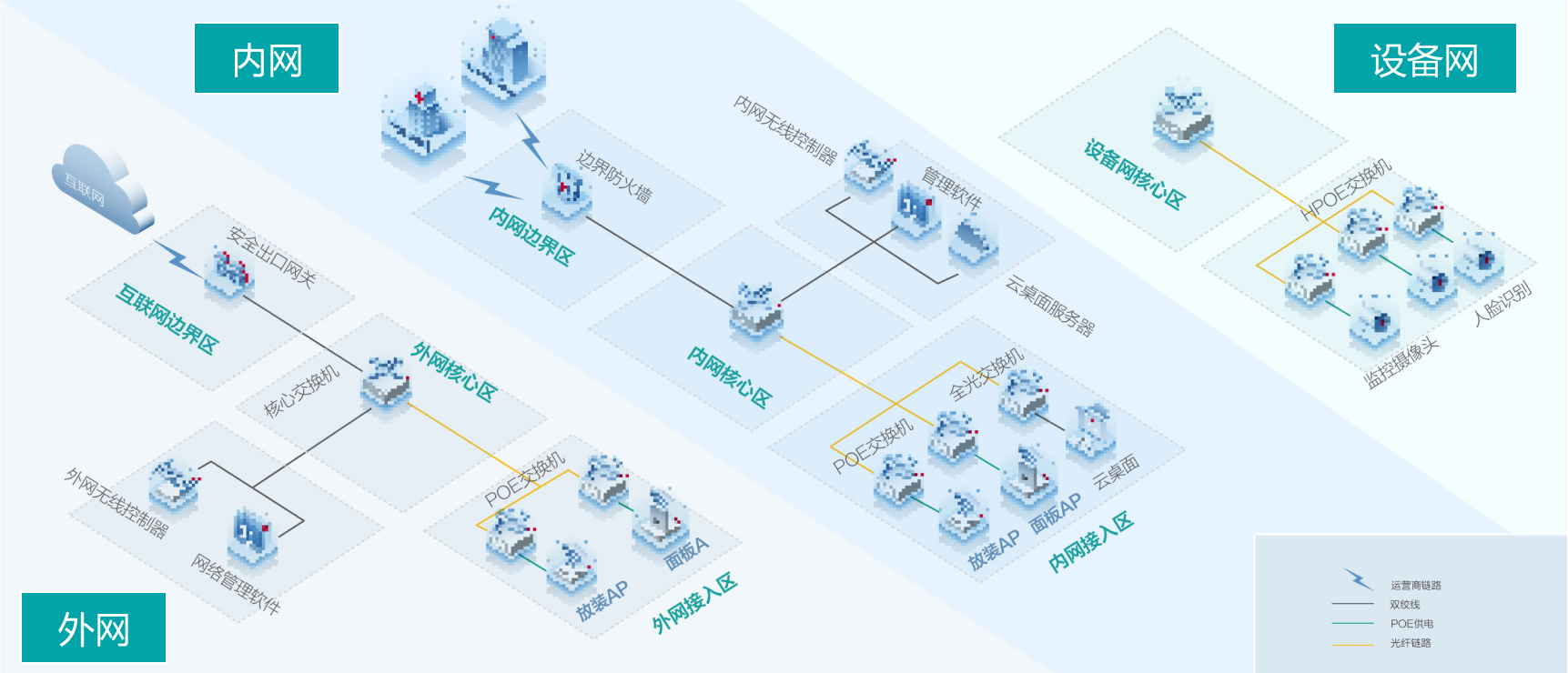 銳捷方艙醫院建設方案,采用極簡以太全光網部署模式,利用一機雙網極簡光交換機,可同時承建業務內網與監控指揮外網,兩張網物理隔離,一體化高效施工;采用云桌面替代傳統PC,實現數百臺桌面終端,一小時內滿載內網業務系統,配備齊全外設,業務全上線,遠程運維管理,減少管理人員進現場感染風險;采用RG-WIS云網平臺,實現網絡設備全生命周期云管理服務,讓管理人員可以通過云網平臺查看設備運行狀態,遠程調試、運維,在方艙高密度的收治空間內,為降低感染風險,安全運維助力。